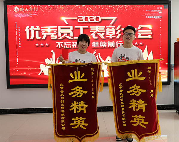 ?2020年7月6日,普天同創(chuàng)舉行6月優(yōu)秀員工表彰大會。總經(jīng)理岳維、業(yè)務(wù)經(jīng)理周麗為6月業(yè)務(wù)標(biāo)兵秦夢雅、胡雪成頒發(fā)榮譽(yù)錦旗和獎金。希望他們在今后的工作中再接再厲、全力以赴、爭創(chuàng)佳績;也希望其他員工以他們?yōu)榘駱樱瑢W(xué)習(xí)他們工作精神、工作態(tài)度,能夠在次月中加入他們,獲得自己的榮譽(yù)。