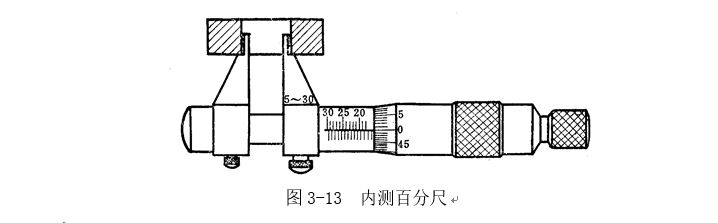 內(nèi)測百分尺如圖3-13所示,是測量小尺寸內(nèi)徑和內(nèi)側(cè)面槽的寬度。其特點是容易找正內(nèi)孔直徑,測量方便。國產(chǎn)內(nèi)測百分尺的讀數(shù)值為0.01mm,測量范圍有5~30和25~50mm的兩種,圖3-13所示的是5~30mm的內(nèi)測百分尺。內(nèi)測百分尺的讀數(shù)方法與外徑百分尺相同,只是套筒上的刻線尺寸與外徑百分尺相反,另外它的測量方向和讀數(shù)方向也都與外徑百分尺相反。