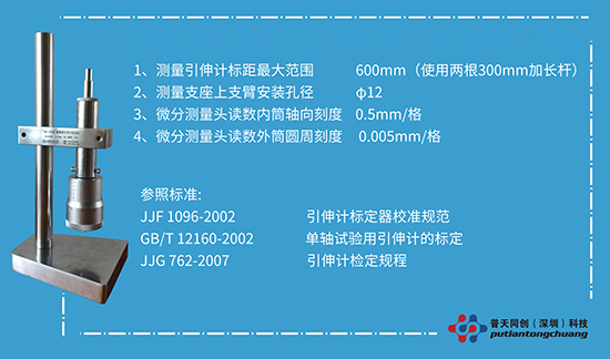本儀器由精密微分測(cè)量頭、底座支架和加長(zhǎng)桿等組成。可以方便地進(jìn)行多種規(guī)格型號(hào)引伸計(jì)的計(jì)量標(biāo)定。精密微分測(cè)量頭由滑動(dòng)量桿、量桿套筒、讀數(shù)內(nèi)筒、讀數(shù)外筒及高精密螺紋付組成。其最大量程25mm;最小分度(游標(biāo)分度) 0.001mm。