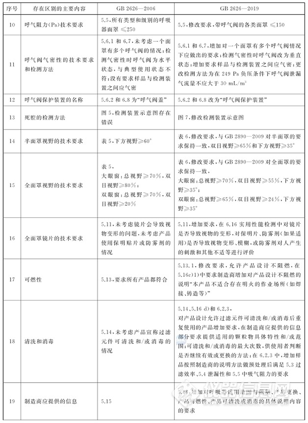 新標(biāo)準(zhǔn)在顆粒物過(guò)濾效率檢測(cè)方法(檢測(cè)設(shè)備分辨率、顆粒物粒徑的換算方法、KP過(guò)濾元件過(guò)濾效率加載測(cè)試終點(diǎn)判斷方法)、泄露性的檢測(cè)方法、呼吸阻力的檢測(cè)方法、呼吸阻力的技術(shù)要求、呼氣閥氣密性的技術(shù)要求和檢測(cè)方法、呼氣閥保護(hù)裝置的名稱(chēng)、死腔的檢測(cè)方法、半面罩視野的技術(shù)要求、全面罩視野的技術(shù)要求、全面罩鏡片的技術(shù)要求、可燃性、清洗和消毒、制造商應(yīng)提供的信息、使用性能、頭帶測(cè)試方法等方面的要求都進(jìn)一步細(xì)化。