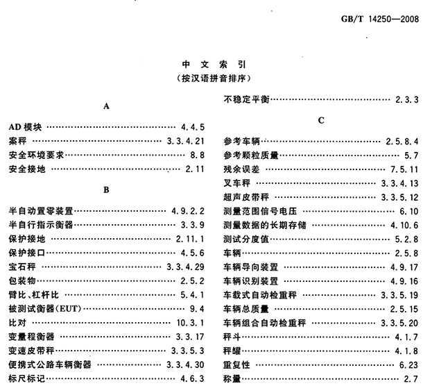 GB/T 14250- 2008 衡器術(shù)語(yǔ) 標(biāo)準(zhǔn)規(guī)范規(guī)定了衡器專業(yè)的術(shù)語(yǔ)及其定義,適用于衡器的標(biāo)準(zhǔn)編寫(xiě)、書(shū)籍出版、文件編制、技術(shù)交流等技術(shù)方面。