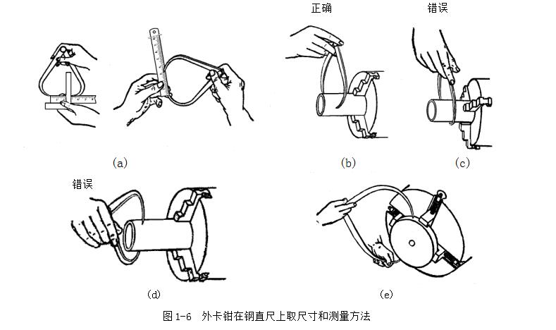 用巳在鋼直尺上取好尺寸的外卡鉗去測量外徑時,要使兩個測量面的聯(lián)線垂直零件的軸線,靠外卡鉗的自重滑過零件外圓時,我們手中的感覺應該是外卡鉗與零件外圓正好是點接觸,此時外卡鉗兩個測量面之間的距離,就是被測零件的外徑。所以,用外卡鉗測量外徑,就是比較外卡鉗與零件外圓接觸的松緊程度,如圖1-6(b)以卡鉗的自重能剛好滑下為合適。如當卡鉗滑過外圓時,我們手中沒有接觸感覺,就說明外卡鉗比零件外徑尺寸大,如靠外卡鉗的自重不能滑過零件外圓,就說明外卡鉗比零件外徑尺寸小。切不可將卡鉗歪斜地放上工件測量,這樣有誤差。圖1-6(c) 所示。由于卡鉗有彈性,把外卡鉗用力壓過外圓是錯誤的,更不能把卡鉗橫著卡上去,圖1-6(d) 所示。對于大尺寸的外卡鉗,靠它自重滑過零件外圓的測量壓力已經太大了,此時應托住卡鉗進行測量,圖1-6(e)所示。