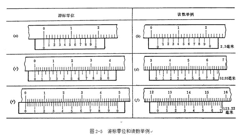 圖2―5(e) 所示,主尺每小格1mm,當兩爪合并時,游標上的50格剛好等于主尺上的49mm,則游標每格間距=49mm÷50=0.98mm