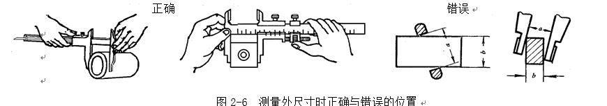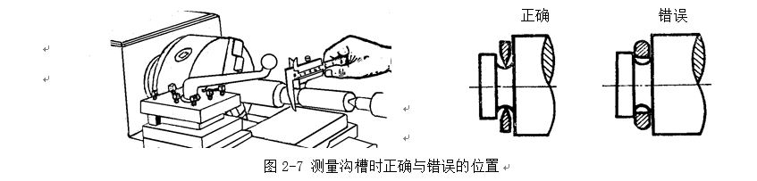 測(cè)量溝槽時(shí),應(yīng)當(dāng)用量爪的平面測(cè)量刃進(jìn)行測(cè)量,盡量避免用端部測(cè)量刃和刀口形量爪去測(cè)量外尺寸。而對(duì)于圓弧形溝槽尺寸,則應(yīng)當(dāng)用刃口形量爪進(jìn)行測(cè)量,不應(yīng)當(dāng)用平面形測(cè)量刃進(jìn)行測(cè)量,如2-7所示。