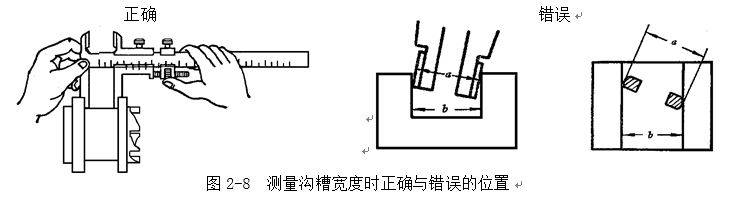 測(cè)量溝槽寬度時(shí),也要放正游標(biāo)卡尺的位置,應(yīng)使卡尺兩測(cè)量刃的聯(lián)線垂直于溝槽,不能歪斜.否則,量爪若在如圖2-8所示的錯(cuò)誤的位置上,也將使測(cè)量結(jié)果不準(zhǔn)確(可能大也可能小)。