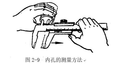 4 當(dāng)測(cè)量零件的內(nèi)尺寸時(shí):圖2-9所示。要使量爪分開的距離小于所測(cè)內(nèi)尺寸,進(jìn)入零件內(nèi)孔后,再慢慢張開并輕輕接觸零件內(nèi)表面,用固定螺釘固定尺框后,輕輕取出卡尺來讀數(shù)。取出量爪時(shí),用力要均勻,并使卡尺沿著孔的中心線方向滑出,不可歪斜,免使量爪扭傷;變形和受到不必要的磨損,同時(shí)會(huì)使尺框走動(dòng),影響測(cè)量精度。