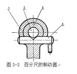 百分尺的制動(dòng)器,就是測(cè)微螺桿的鎖緊裝置,其結(jié)構(gòu)如圖3-3所示。制動(dòng)軸4的圓周上,有一個(gè)開著深淺不均的偏心缺口,對(duì)著測(cè)微螺桿2。當(dāng)制動(dòng)軸以缺口的較深部分對(duì)著測(cè)量桿時(shí),測(cè)量桿2就能在軸套3內(nèi)自由活動(dòng),當(dāng)制動(dòng)軸轉(zhuǎn)過一個(gè)角度,以缺口的較淺部分對(duì)著測(cè)量桿時(shí),測(cè)量桿就被制動(dòng)軸壓緊在軸套內(nèi)不能運(yùn)動(dòng),達(dá)到制動(dòng)的目的。