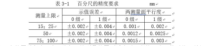 百分尺是一種應(yīng)用很廣的精密量具,按它的制造精度,可分0級和1級的兩種,0級精度較高,1級次之。百分尺的制造精度,主要由它的示值誤差和測砧面的平面平行度公差的大小來決定,小尺寸百分尺的精度要求,見表3-1。從百分尺的精度要求可知,用百分尺測量IT6~IT10級精度的零件尺寸較為合適。